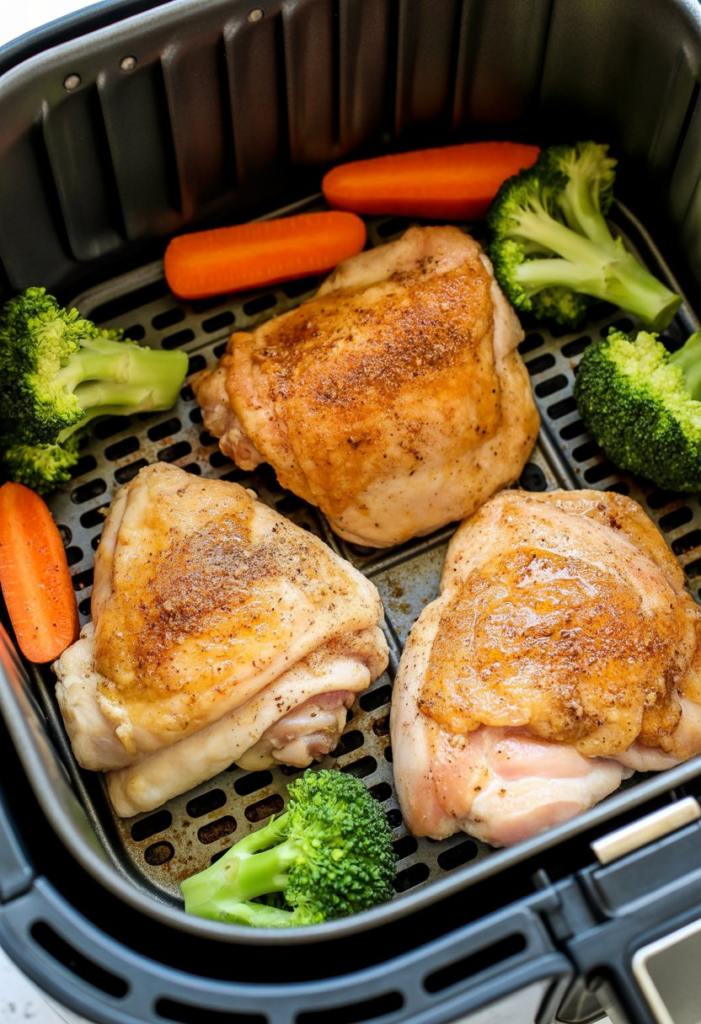 Pat the chicken thighs dry with kitchen paper, then rub with olive oil, paprika, salt, and pepper. Place them skin-side down in the air fryer basket and cook at 200°C (390°F) for 12 minutes. Flip them over and cook for another 10–12 minutes until golden, crispy, and cooked through.
