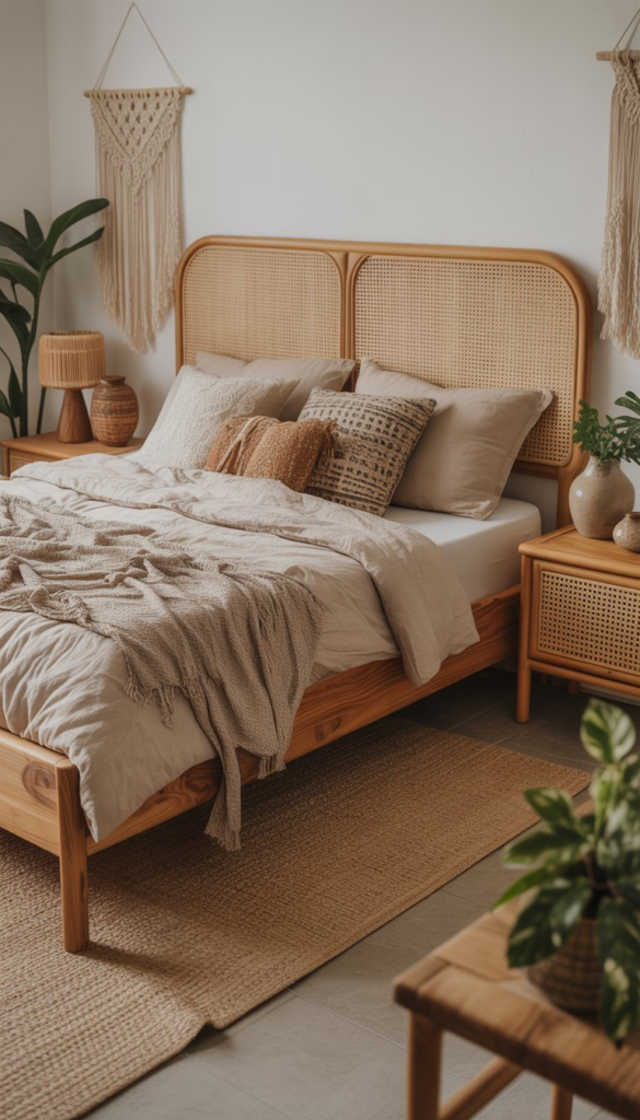 Bring in natural wood and rattan pieces to give your bedroom a grounded, earthy feel. These materials add warmth and texture without feeling heavy or cluttered. Plus, they work great with other boho elements you already have.