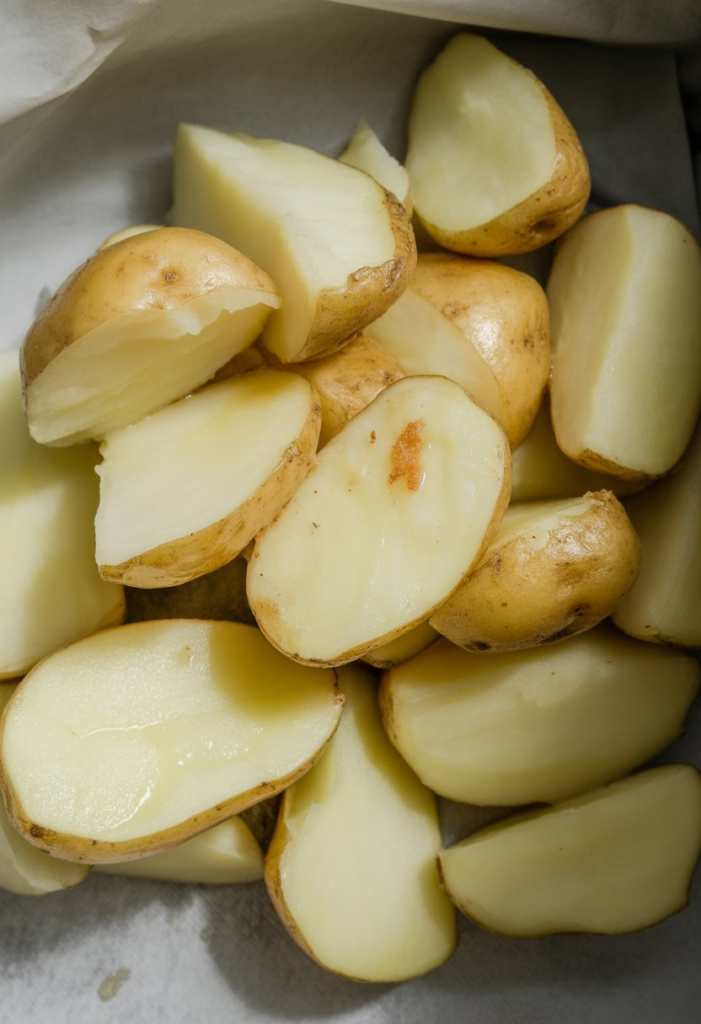 - Parboil (the game changer): Boil the potatoes for 5–7 minutes until just starting to soften. Drain well and give them a little shake in the pan to rough up the edges—that’s where the crunch comes from.