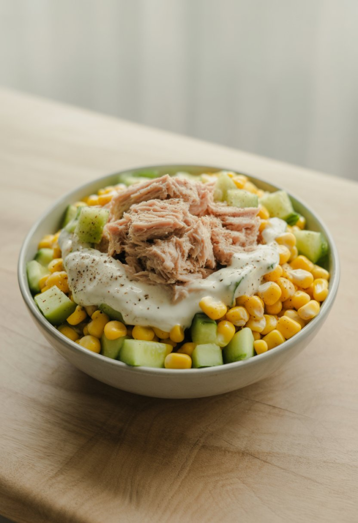• Grab a medium bowl, add the drained tuna, and break it up with a fork. Stir through the mayo, then fold in the sweetcorn and cucumber. Season with salt and pepper, give it one last mix, and that’s it, you’re done!